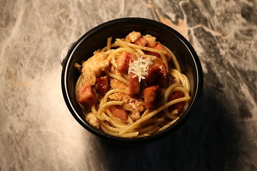 Карбонара с копчёной индейкой и куриным филе
